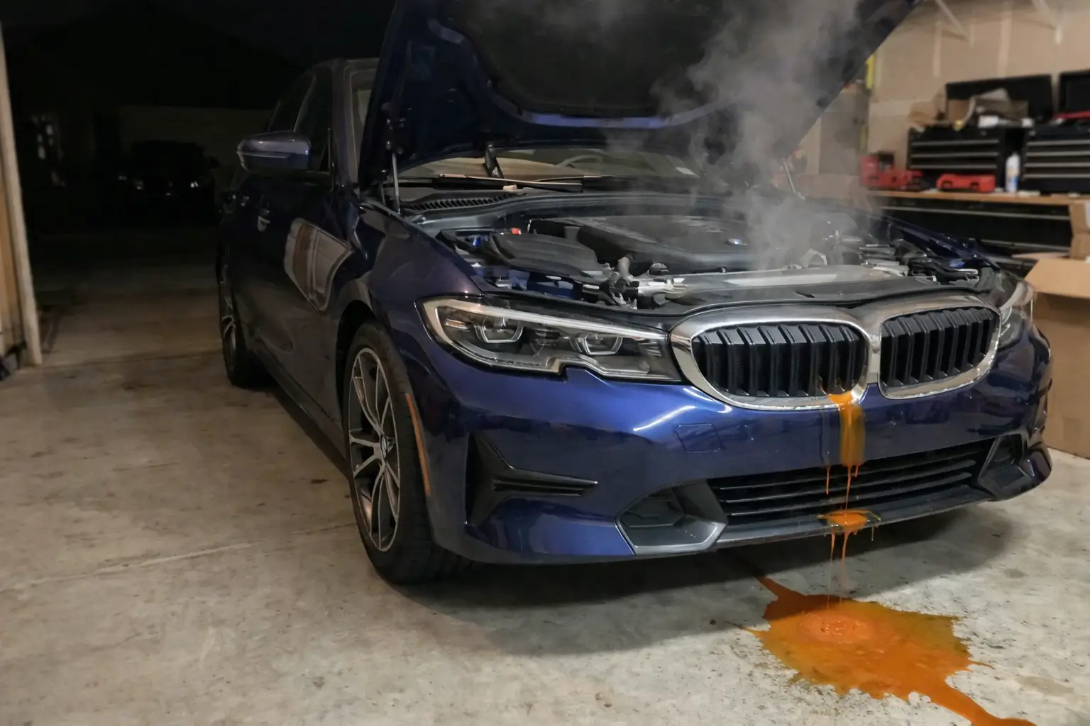 External leaks leave visible residue under the vehicle, greenish or pinkish puddles that feel slippery between fingers. The leaked coolant attracts pets who find the sweet taste appealing, but ethylene glycol is highly toxic and causes kidney failure.